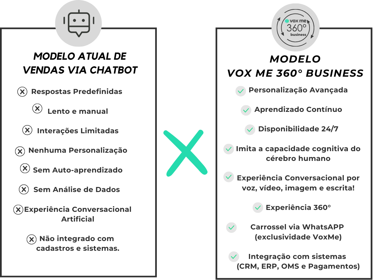 Vox Me 360° Business é a solução de chat-commerce inteligente disponível 24/7, pronta para atender seus clientes com a personalidade única da sua marca!